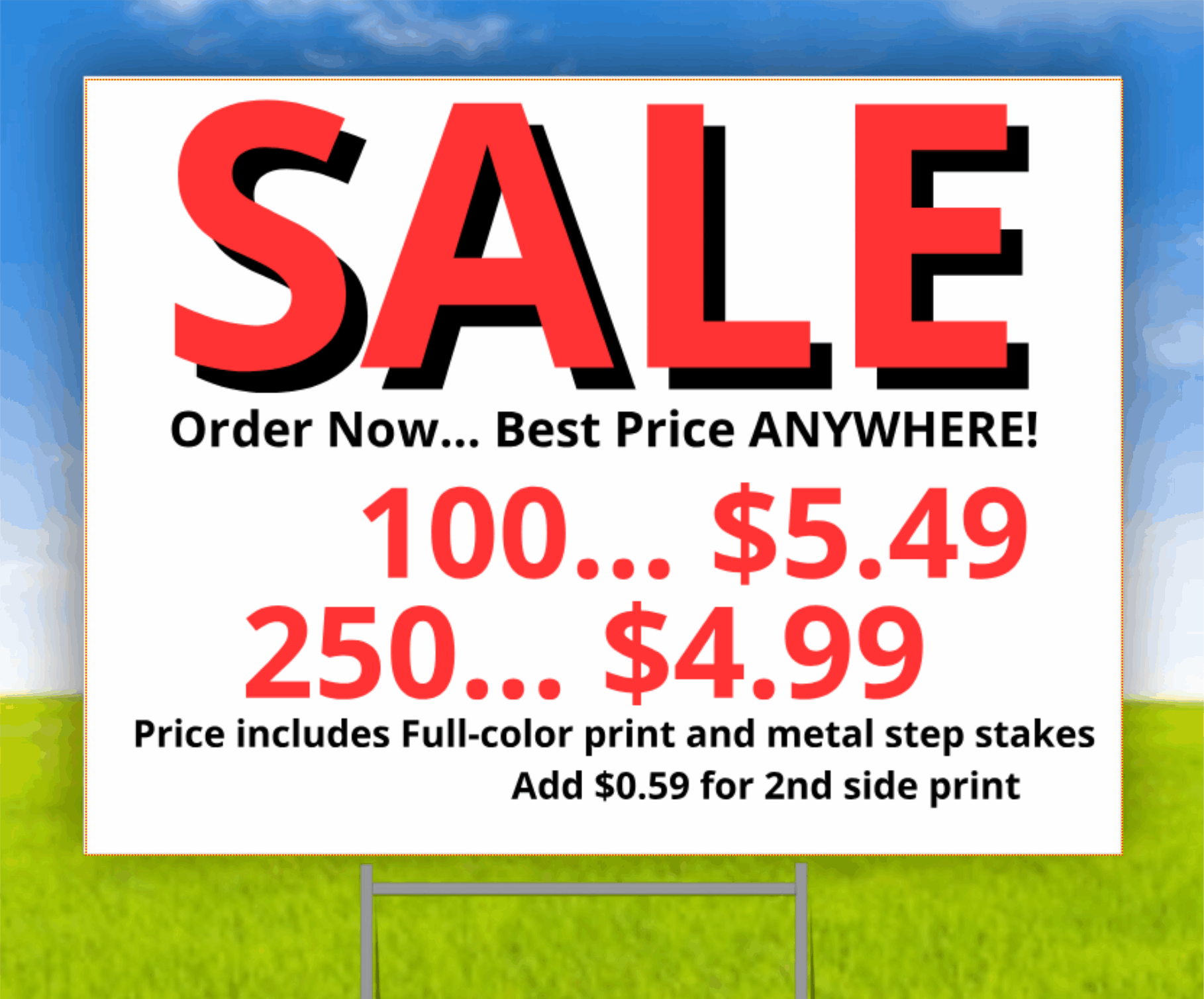 Our corrugated PVC yard signs are 24" wide by 18" tall,  UV printed with your design printed on one or both sides.  Metal ground stakes are included at no additional cost.